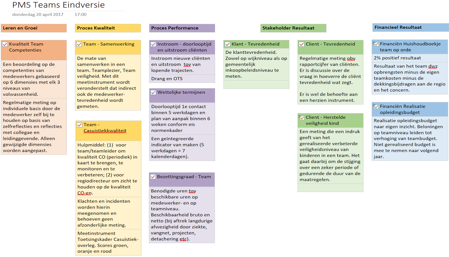 Een prestatiemeetsysteem voor zelfsturende teams met als doel een hulpmiddel te bieden om te sturen op eigen prestaties en het verbeteren van het lerend vermogen met behulp van benchmarking. Uitgangspunten zijn transparantie en het verminderen van regels en controles. Dit moet leiden tot meer capaciteit in de uitvoering, minder management en minder centrale overhead.
